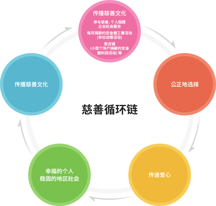 人们在大家的参与下获得力呈,又接二连三参与到 慈善当中,使慈善的循环链越来越强大。